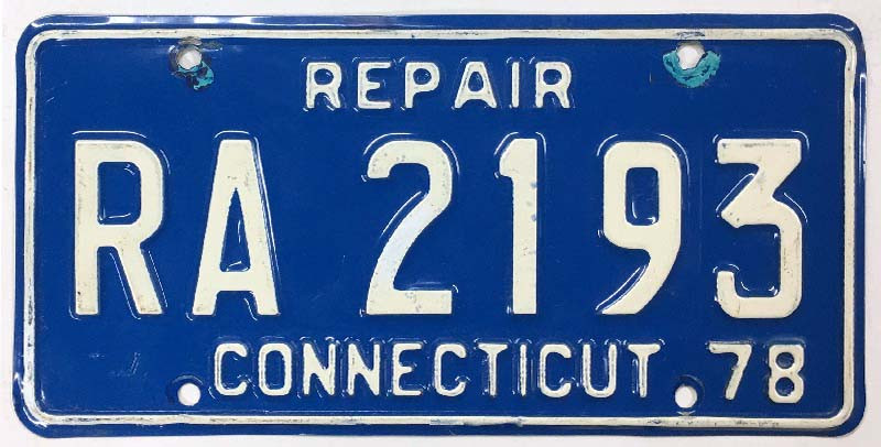 Click the button below to add the Connecticut 1978 Repair License Plate - RA2193 to your wish list.