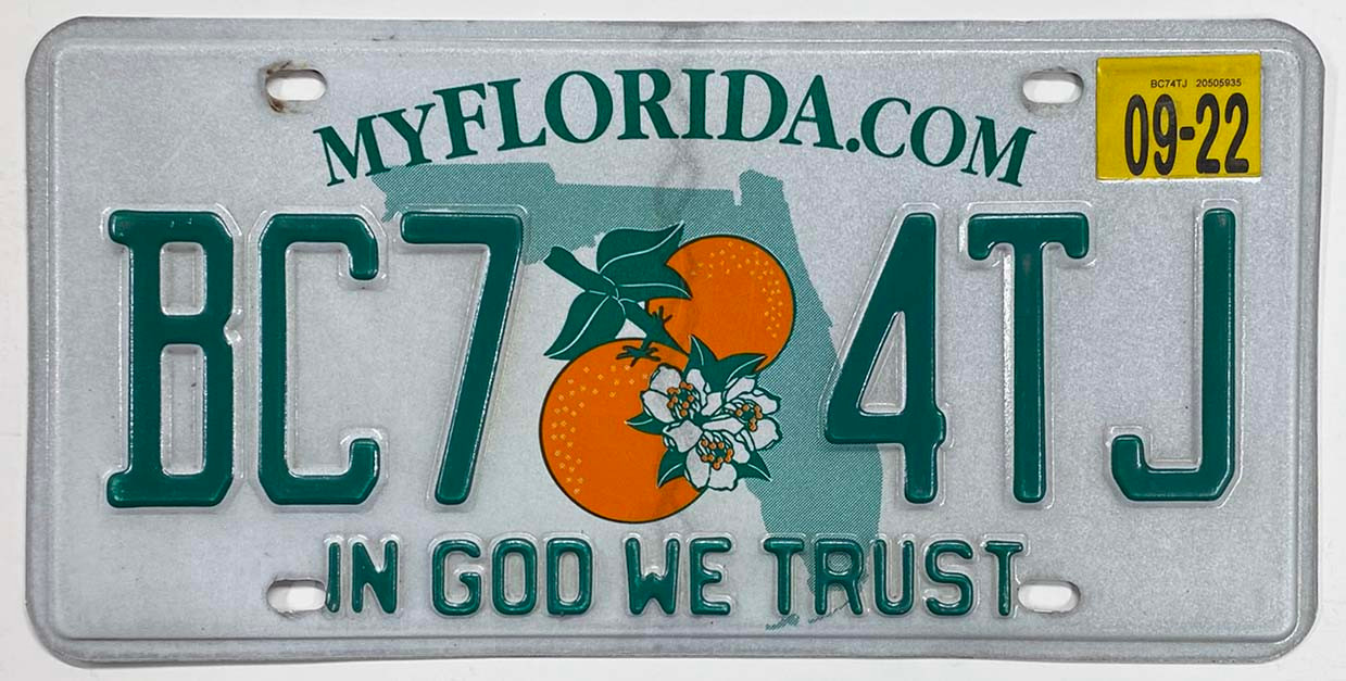 Click the button below to add the Florida 2022 "Orange Blossom" In God We Trust License Plate - BC74TJ to your wish list.