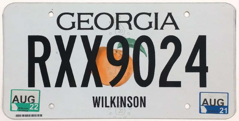 Click the button below to add the Georgia 2022 "Giant Peach" Wilkinson County License Plate - RXX9024 to your wish list.