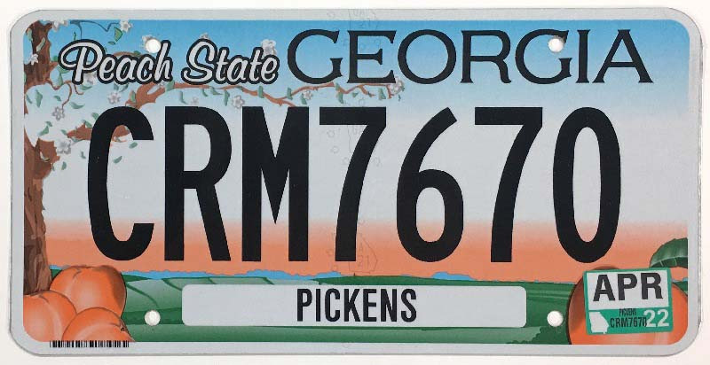 Click the button below to add the Georgia 2022 "Peach Tree" Pickens County License Plate - CRM7670 to your wish list.