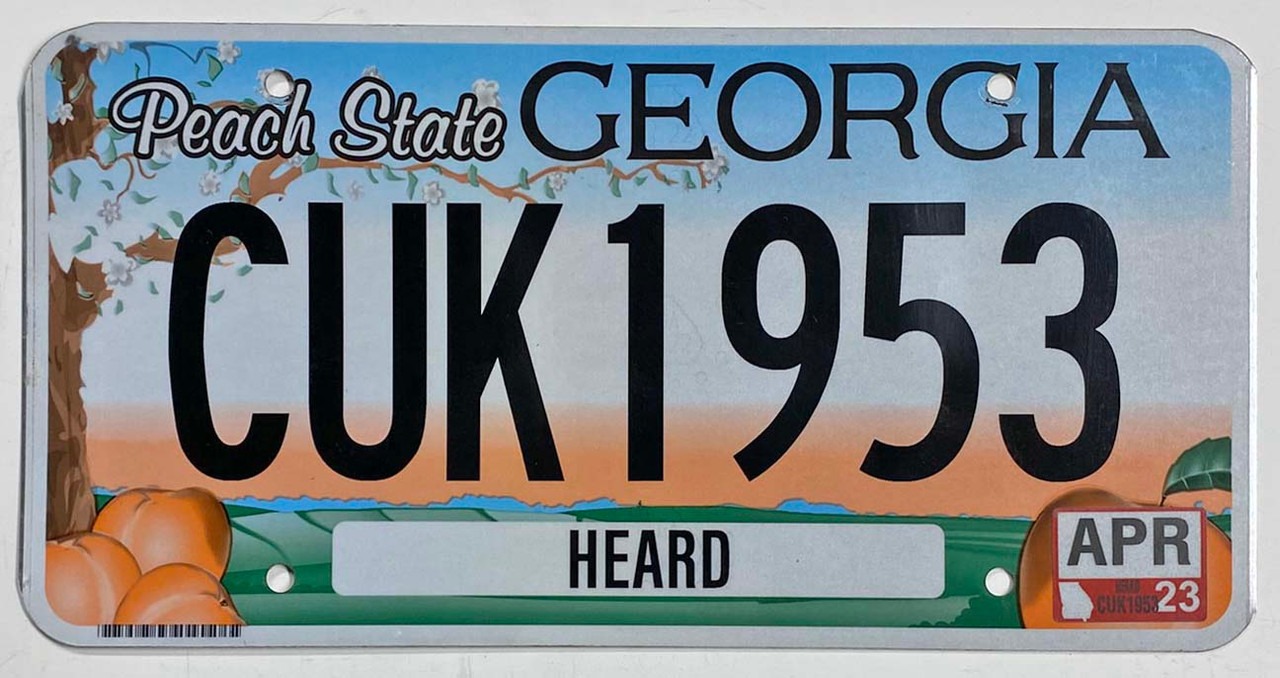 Click the button below to add the Georgia 2023 "Peach Tree" Heard County License Plate - CUK1953 to your wish list.