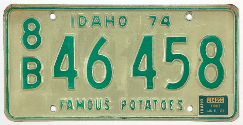 Click the button below to add the Idaho 1974 1976 "Famous Potatoes" Bonneville County License Plate - 8B46458 to your wish list.
