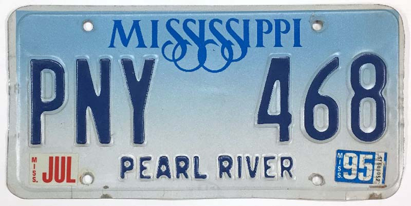 Click the button below to add the Mississippi 1995 "Blue Fade" Pearl River County License Plate - PNY468 to your wish list.