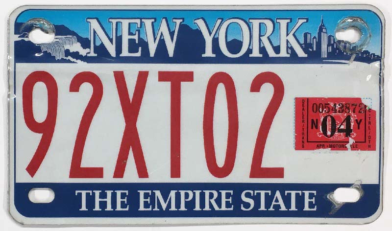 Click the button below to add the New York 2004 "Niagara Falls" Motorcycle License Plate - 92XT02 to your wish list.