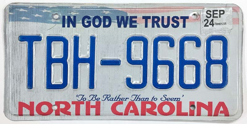 Click the button below to add the North Carolina 2024 In God We Trust License Plate - TBH9668 to your wish list.