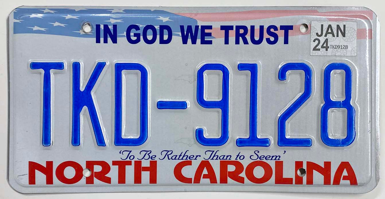 Click the button below to add the North Carolina 2024 "In God We Trust" License Plate - TKD9128 to your wish list.