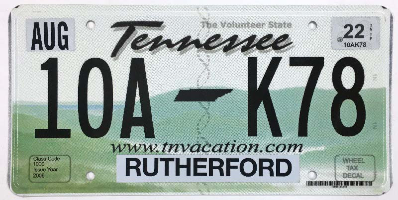 Click the button below to add the Tennessee 2022 "Green Rolling Hills" Rutherford County License Plate - 10AK78 to your wish list.