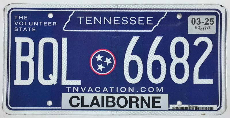 Click the button below to add the Tennessee 2024 "Three Stars" Claiborne County License Plate - BQL6682 to your wish list.