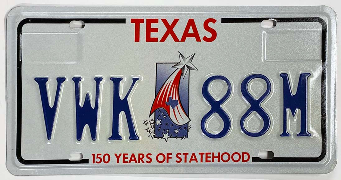 Click the button below to add the Texas 1995-1996 150 Years of Statehood License Plate - VWK88M to your wish list.