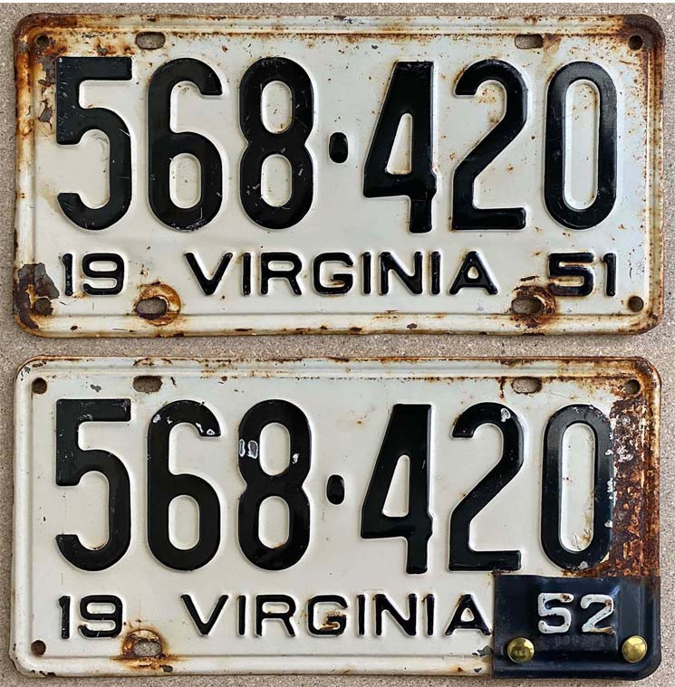 Click the button below to add the Virginia 1951 1952 License Plate Pair - 568420 to your wish list.