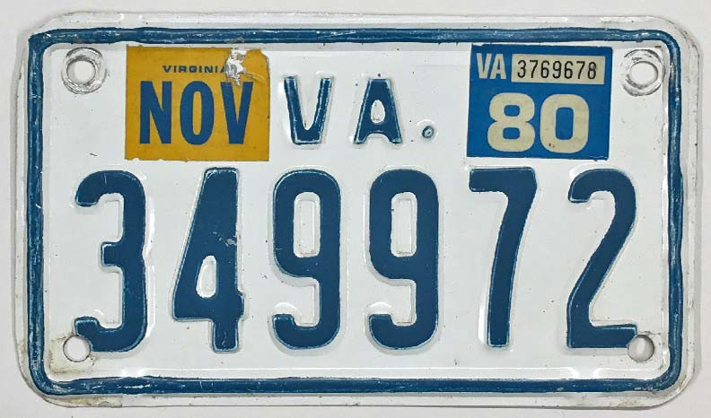 Click the button below to add the Virginia 1980 Motorcycle License Plate - 349972 to your wish list.
